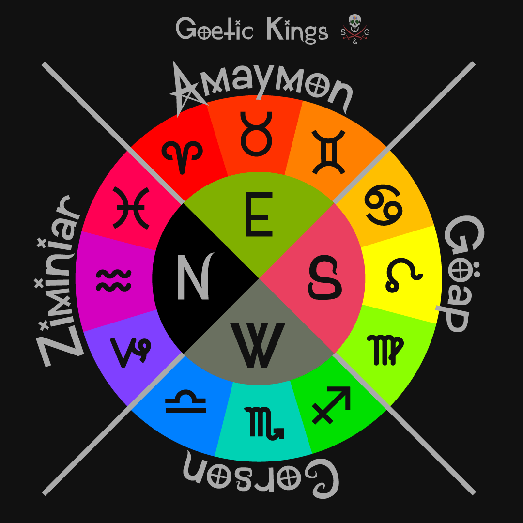 "These 72 Kings are under the Power of Amaymon, Corson, Ziminiar, & Göap, who are the Four Great Kings ruling in the Four Quarters, or Cardinal Points, viz: East, West, North, & South, and are not to be called forth except it be upon Great Occasions; but are to be Invocated and Commanded to send such or such a Spirit that is under their Power and Rule, as is shown in the following Invocations and Conjurations. And the Chief Kings may be bound from 9 till 12 o’clock at Noon, and from 3 till sunset." - Observations The best I can figure is to use the attribution of each Spirit as a day (the 1st 5°) or night (the 2nd 5°) decan of the Zodiac, and further associating the four seasons with the four cardinal directions based on the (northern hemisphere) direction of the diurnal correlate to the annual season (viz. spring = dawn, summer = noon, &c.), determine which Great King rules which Spirit via their associated Quarters. |